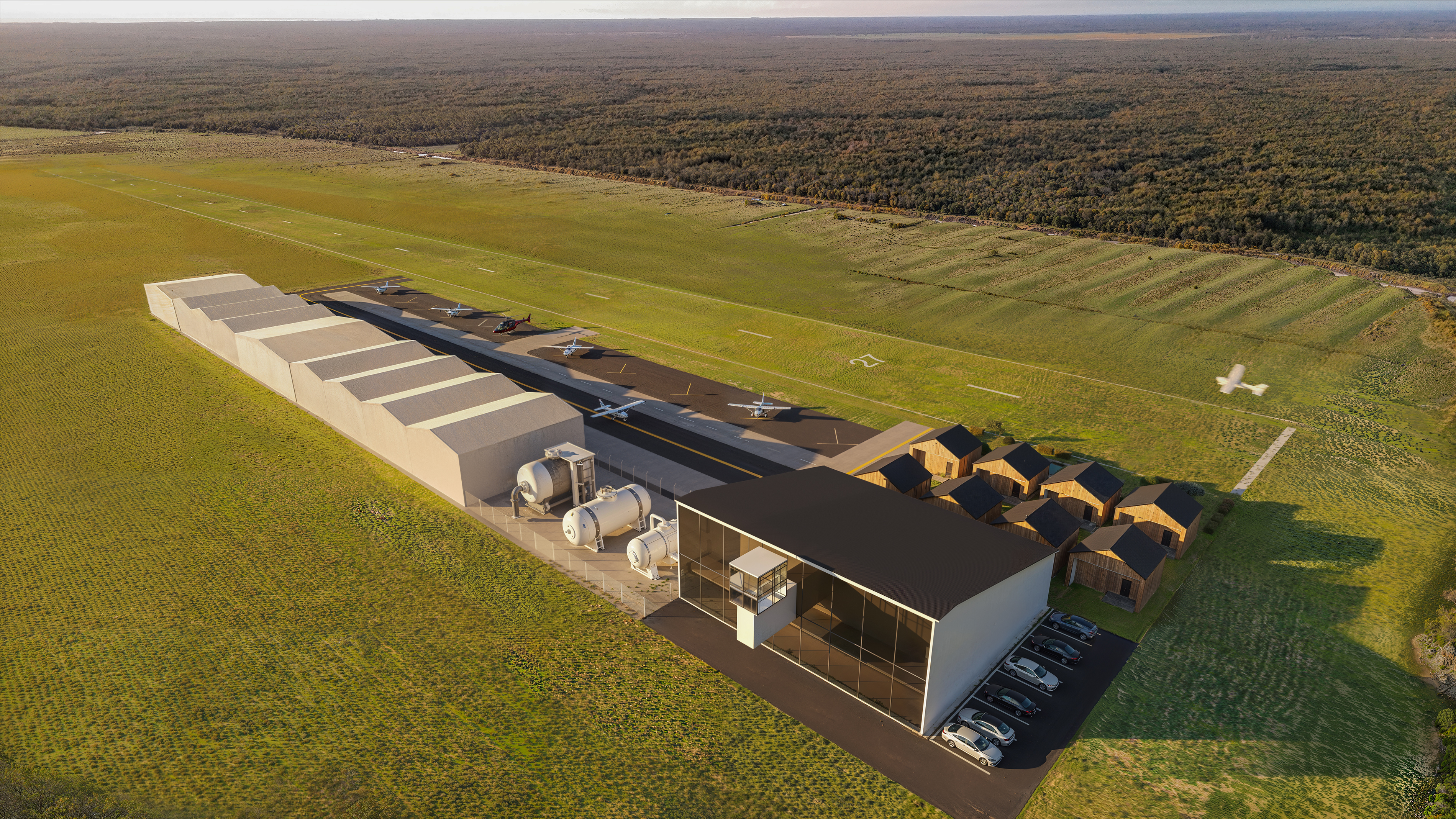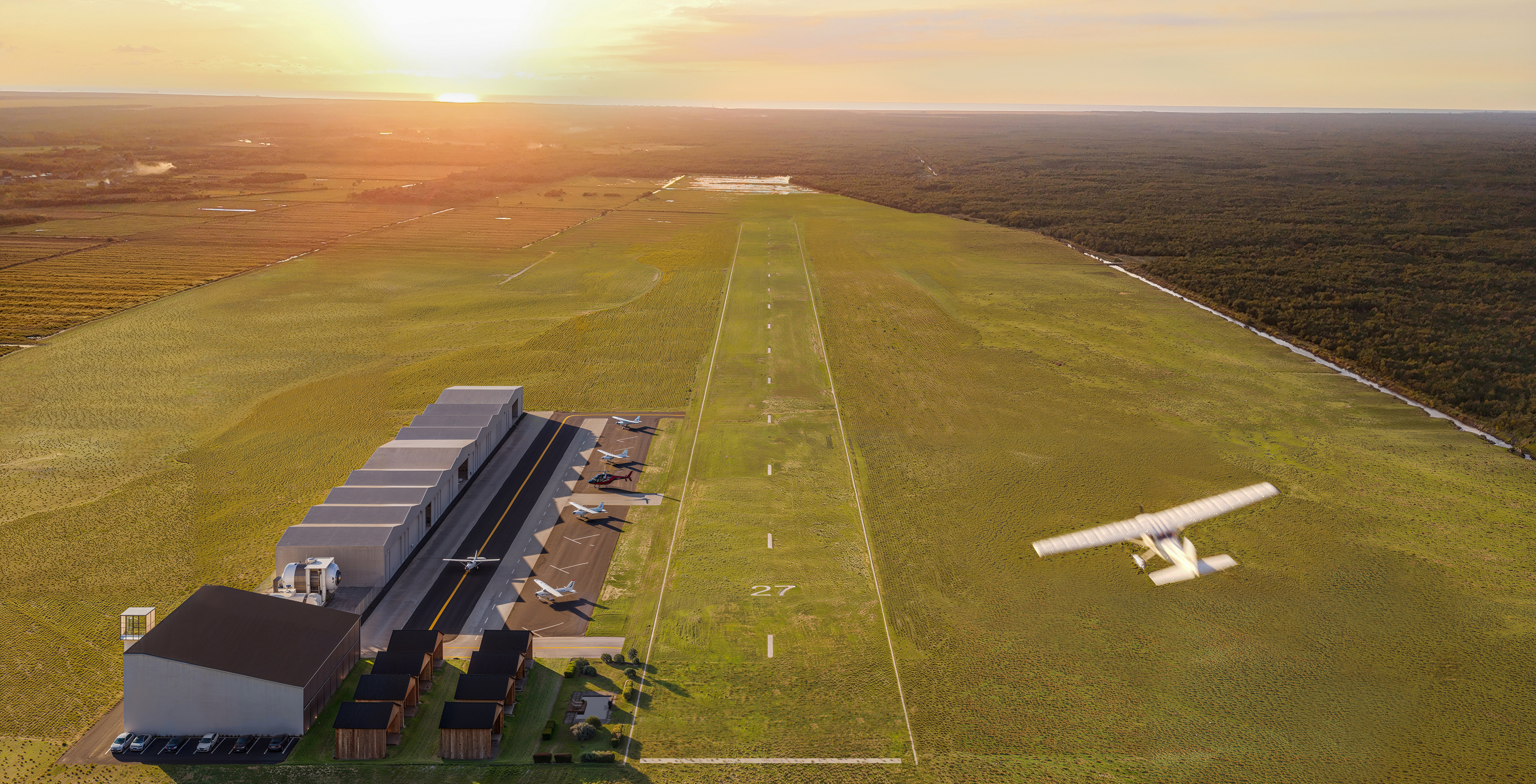 1000 m runway strip, ICAO-compliant apron with 12 GA stands, 15×20 m private hangars, a boutique hotel with an ATC tower, and an optional residential cluster on the land side.